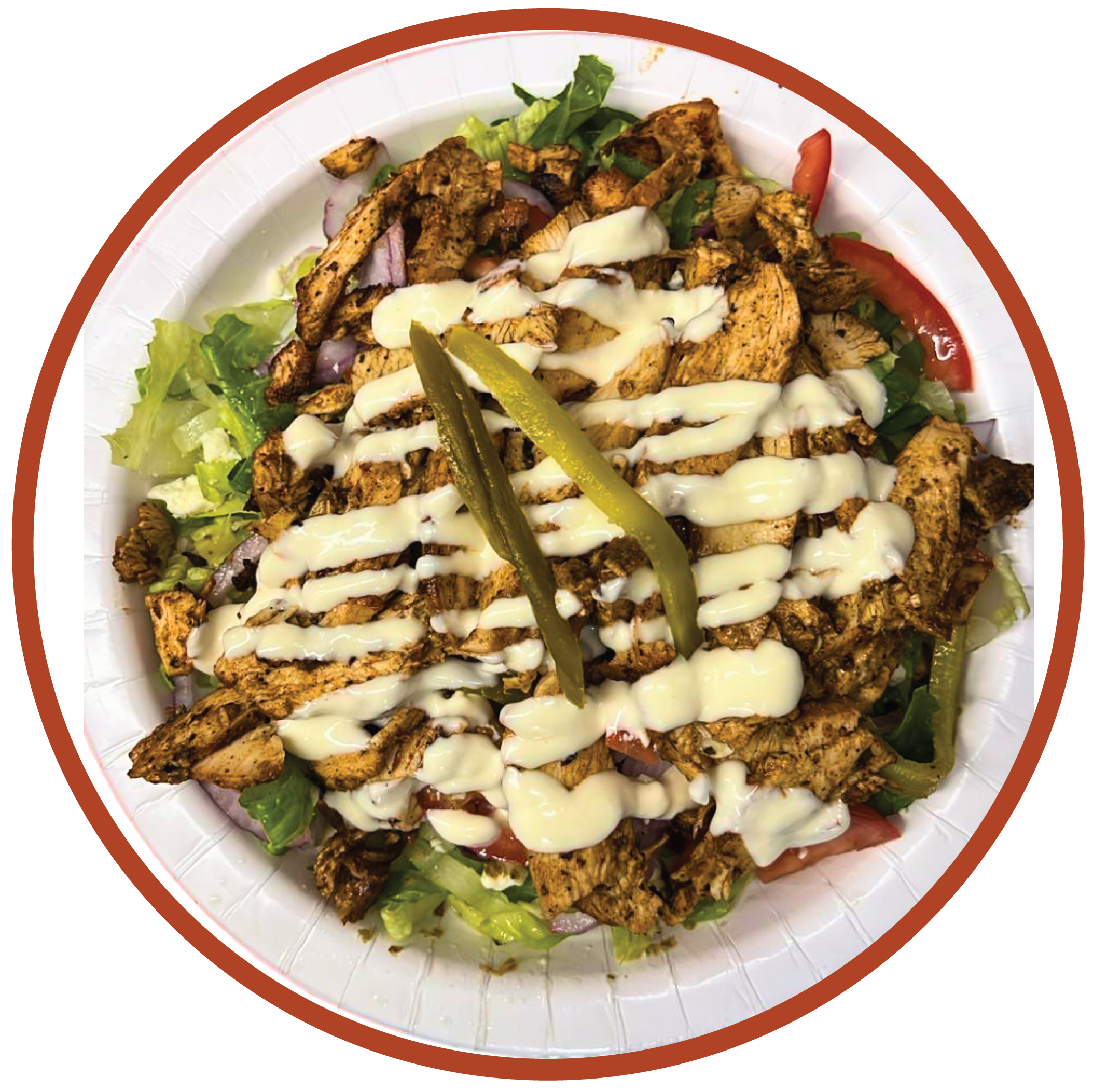 A fresh, protein-packed salad topped with tender shawarma meat, veggies, and creamy dressing.